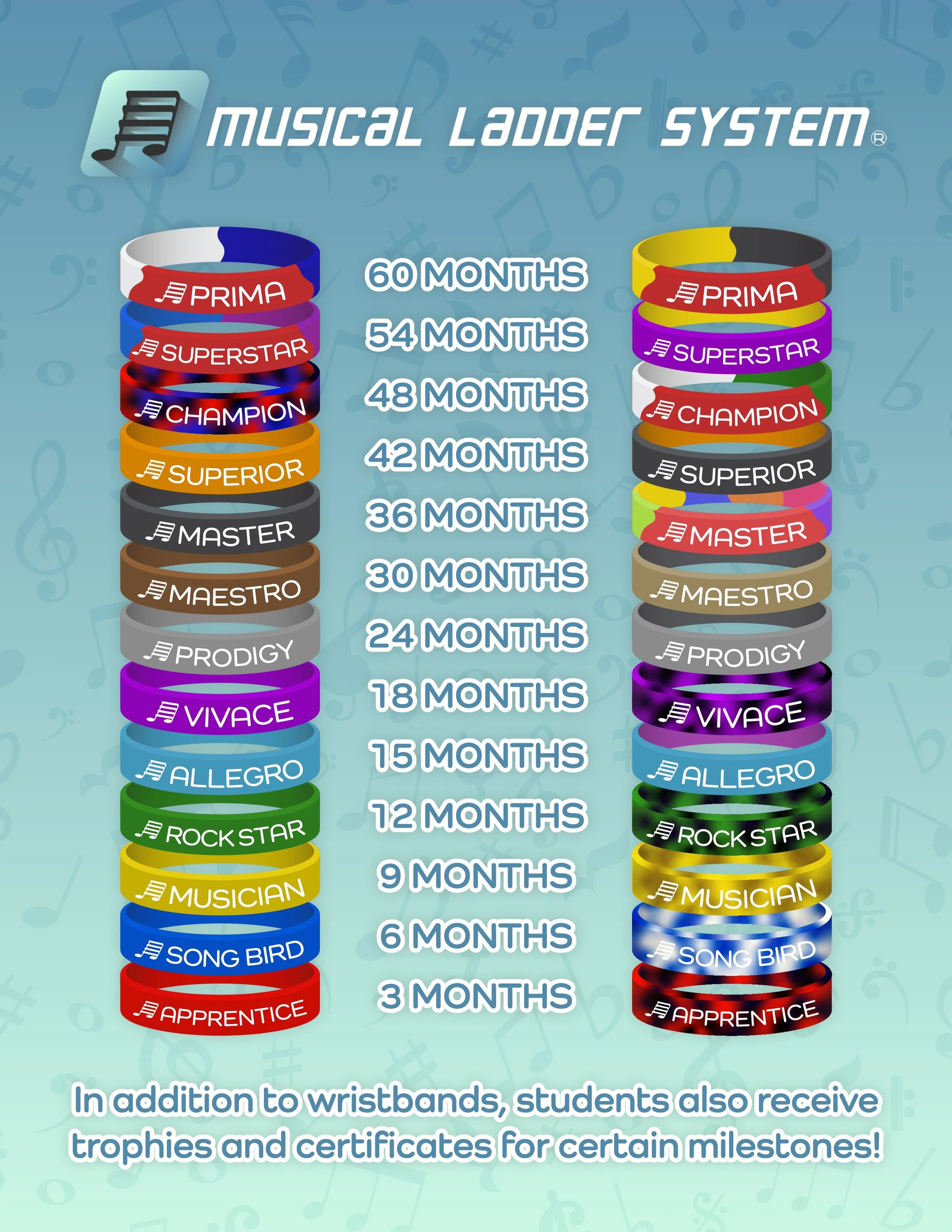 When students complete a Musical Ladder level, they will receive a certificate and a wristband. These will be delivered to your teacher box at a subsequent lesson. Soon, we will also start implementing the trophies, which come at some but not all levels.