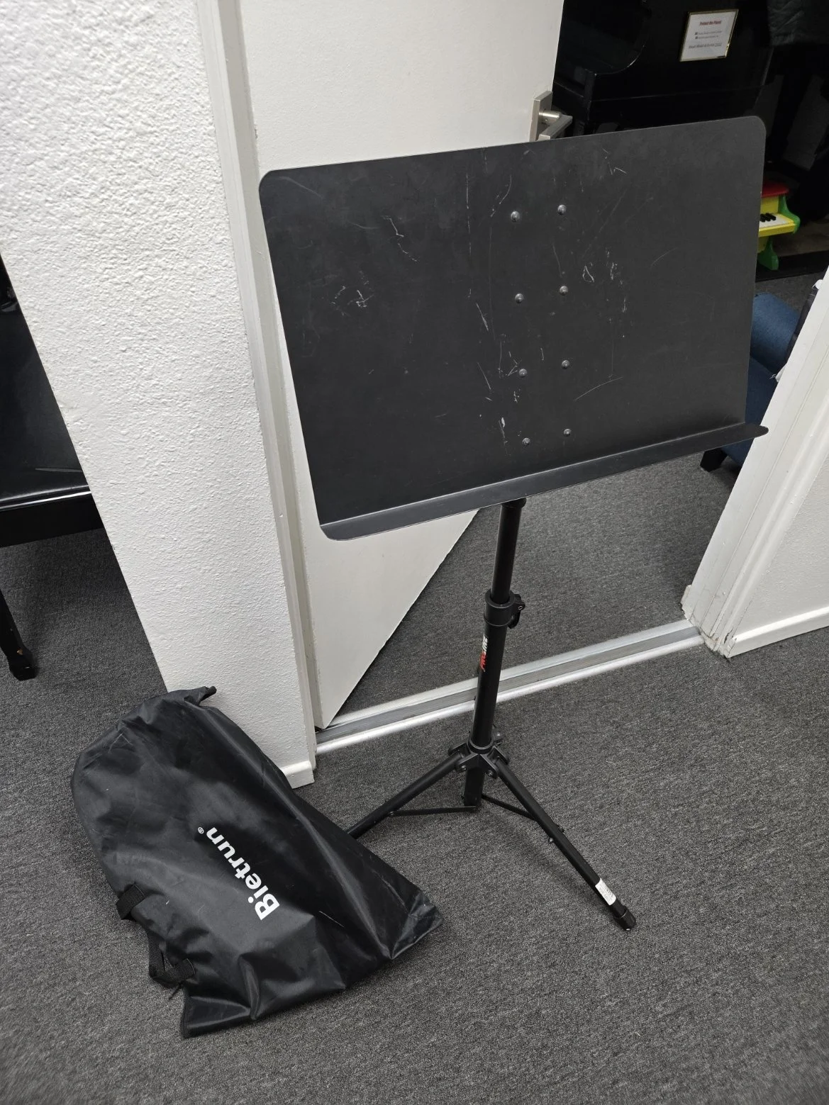 There are music stands already assembled in some of the larger lesson rooms. All of the smaller lesson rooms have unassembled music stands, usually in a bag stored in the room. Please feel free to assemble and use these music stands in a lesson if you need to. Of course, please disassemble and put away where you got it when done.
